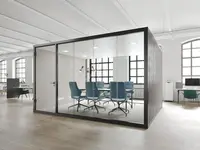 Hochwertige Verglasung, akustische Wirksamkeit, durchdachte Technik und stimmige Materialien machen ihn zum idealen Meetingraum im Grossraumbüro. Beleuchtung und Lüftung sind systemintegriert steuerbar.