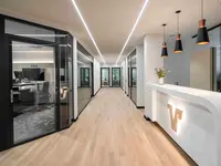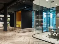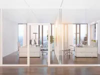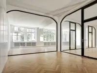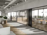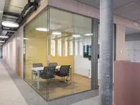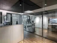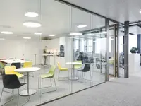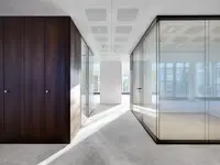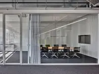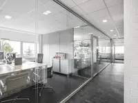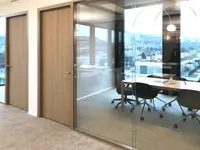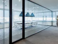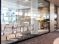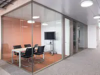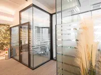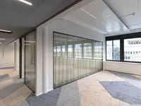 Das Trennwandsystem mit Zweischeiben-Verglasung wird als rahmenlose Ganzglaskonstruktion ohne vertikale Profile ausgeführt. Die Verglasung wird von Boden- und Deckenprofilen gehalten, fügt sich flächenbündig ein und erfüllt höchste Anforderungen an Transparenz und Schallschutz.