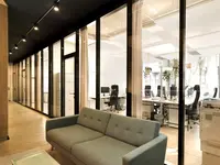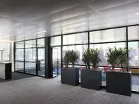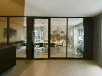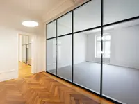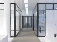 Das versetzbare Trennwandsystem in Stahl-Skelettbauweise (Structural Glazing) wird als frontbündige Doppelverglasung mit flächenbündiger Verklebung ausgeführt. Die Konstruktion verzichtet auf sichtbare Rahmen und lässt sich mit Türelementen kombinieren.