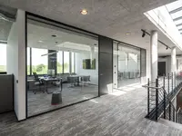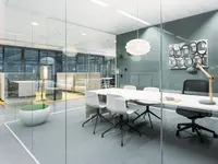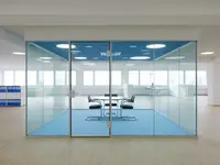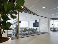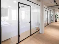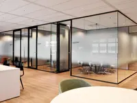 Das System ist ein rahmenloses Trennwandsystem mit filigranen Boden- und Deckenanschlüssen. Es schafft eine ruhige, transparente Raumwirkung – ideal für moderne Arbeitsumgebungen mit hoher Lichtdurchlässigkeit.