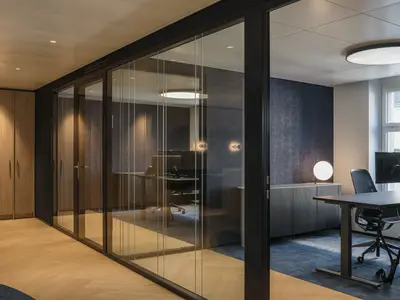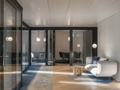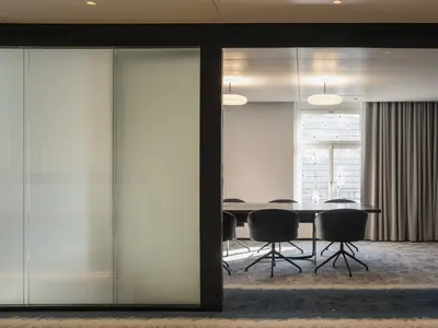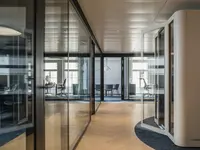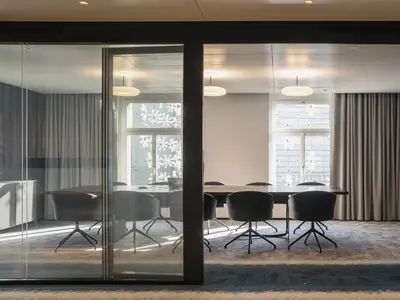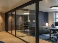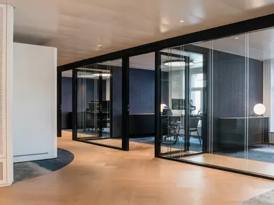 Doppelflügeltüre und Glaswand mit schaltbarem Glas sowie exzellenter Schallschutz im gehobenen Altbau-Ausbau.