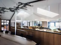 Ein echtes Flagschiff: Glastrennwände mit Mooreichen-Furnier, absturzsichere Gläser und Anschlüsse an asymmetrische Decken.