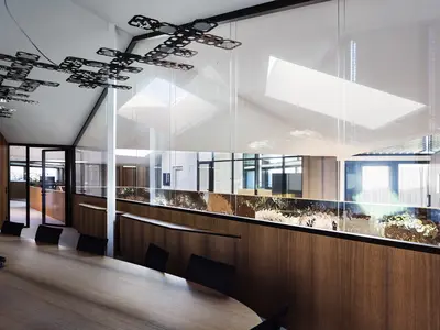 Das Trennwandsystem mit Zweischeiben-Verglasung wird als rahmenlose Ganzglaskonstruktion ohne vertikale Profile ausgeführt. Die Verglasung wird von Boden- und Deckenprofilen gehalten, fügt sich flächenbündig ein und erfüllt höchste Anforderungen an Transparenz und Schallschutz.